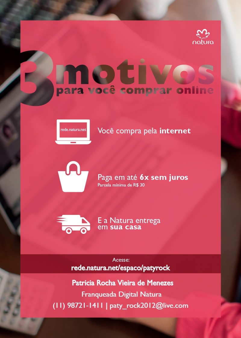 Compre seus cosméticos Natura na minha loja rede.natura.net/espaco/patyrock! Basta se cadastrar através das suas redes sociais ou fazer seu cadastro manual para começar seu pedido agora mesmo!